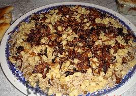 عند الغرف نضع اولا الارز و العدس ثم يوضع عليه المعكرونة ثم الحمص ثم الصلصة ثم البصل على الوجه و الدقة حسب الطلب